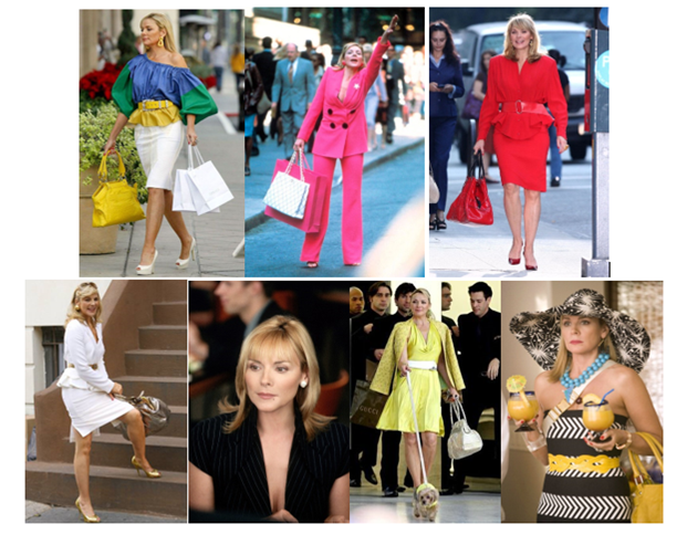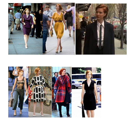Miranda’s style evolved massively during the show. She went from a corporate androgynous style to wearing a colourful array of structured dresses, showing off a more feminine side. One thing you would always find in all her outfits were bold accessories such as statement earrings, belts and fun handbags creating some standout looks.
